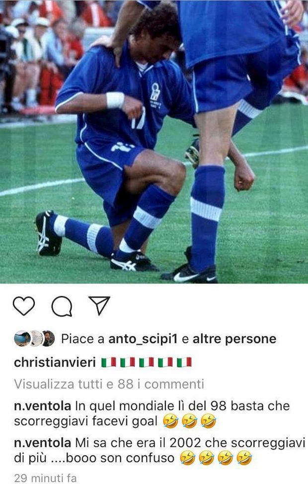 Nel Mondiale di Francia del 1998, l'Italia e il mondo videro una delle migliori versioni mai viste di Christian Vieri, vero trascinatore della Nazionale di Cesare Maldini che si arrese ai padroni di casa solo ai rigori nei quarti di finale. Preso da un momento nostalgico, l'ex attaccante dell'Inter ha condiviso alcune foto su Instagram di quella competizione. E, come di consueto, non sono mancati i commenti scherzosi del suo grande amico, Nicola Ventola. Che, sotto la foto in cui Moriero 'lustra' gli scarpini a Bobo, ha scritto in maniera molto 'rustica': "In quel Mondiale lì del '98 basta che scoreggiavi facevi goal".