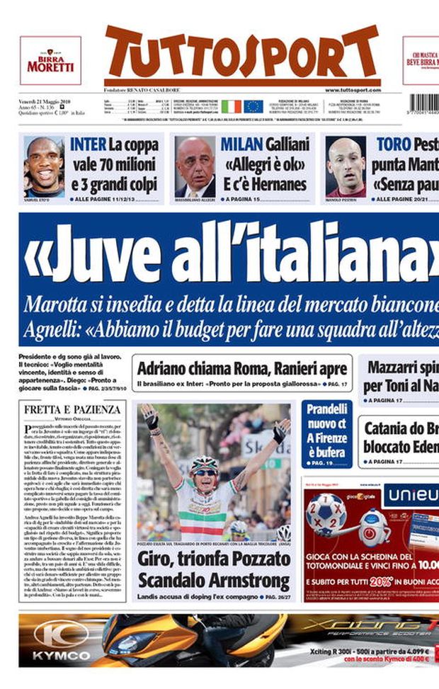Il Corriere dello Sport (il giornale, tra gli sportivi, che più ha voluto fare il tifo nell'edizione in edicola oggi), il 21 maggio, focalizzava la sua attenzione sul punto di Moratti a proposito di Balotelli...