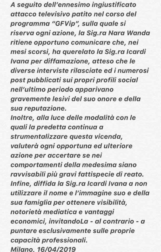 Il botta e risposta tra Wanda Nara e Ivana Icardi prosegue e ora andrà avanti per vie legali. La moglie e agente del calciatore dell'Inter ha comunicato via i social di aver querelato la sorella di Mauro per diffamazione, dato che le dichiarazioni rilasciate da Ivana sono considerate gravemente lesive della sua reputazione e del suo onore. Wanda ha invitato Ivana a non usare il suo nome a scopi economici, ma "a puntare esclusivamente sulle sua capacità professionali".