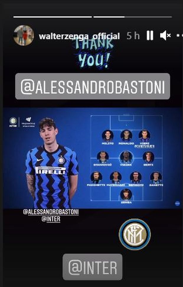 L'ex portiere dell'Inter Walter Zenga ha taggato sulle sue storie su Instagram Alessandro Bastoni e il club nerazzurro. Lo ha fatto perché ha scoperto di essere stato inserito dal difensore interista nella top11 ideale, composta con i giocatori del passato.