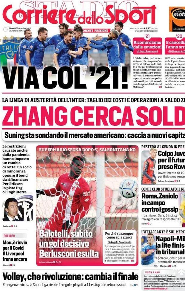 Sulla prima pagina del Corriere dello Sport si parla delle strategie della proprietà dell'Inter per il futuro: "Zhang cerca soldi. Suning sonda il mercato americano: caccia a nuovi capitali. Taglio dei costi e operazioni a saldo zero".
