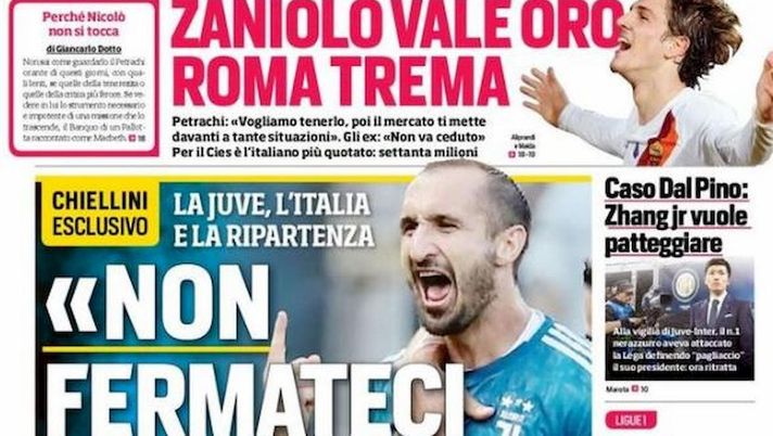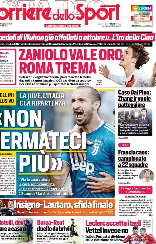 Il Corriere dello Sport mette a confronto Insigne e Lautaro e approfondisce il tema attaccanti per quanto riguarda la prima gara dell'Inter post Covid19, quella di Tim Cup contro il Napoli. Ma c'è anche una finestra in alto in cui si parla del club nerazzurro. "Caso Dal Pino, Zhang jr vuole patteggiare. Alla vigilia di Juve-Inter il numero uno nerazzurro aveva attaccato il presidente della Lega definendolo pagliaccio: ora ritratta", si legge.